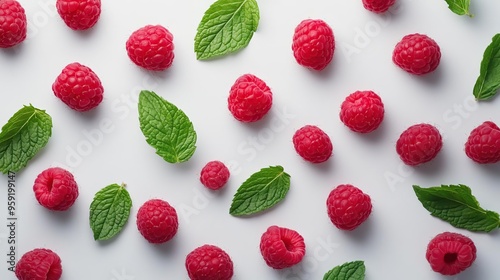 A visually appealing arrangement of raspberries and mint leaves on a white background.