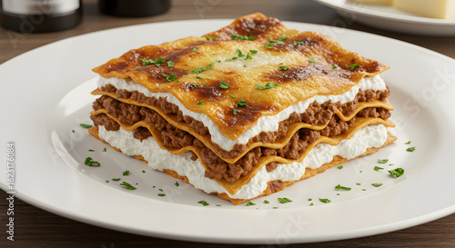 A visually appealing lasagna dish plated on a white plate with garnishing arrangement presenting