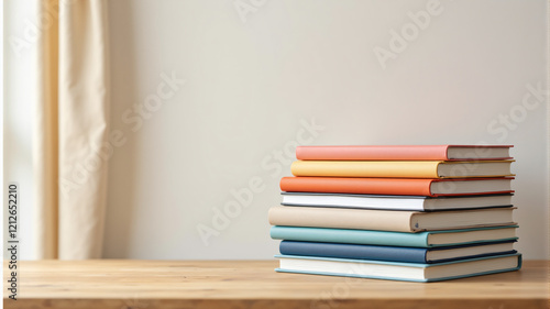 A visually appealing stack of colorful books neatly arranged on a wooden table.