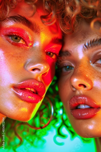 A visually captivating image showcasing a close-up of vibrant, curly hair illuminated by dramatic and colorful abstract lighting creating a lively and energetic mood.