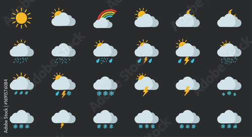 A visually engaging collection of flat design weather icons, illustrating various atmospheric conditions from bright sunshine, stormy clouds, and gentle rain.
