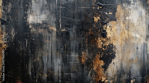 A visually rich grunge surface blending dark black textures with warm gold tones creating a striking and rough abstract design suitable for artistic interpretations.