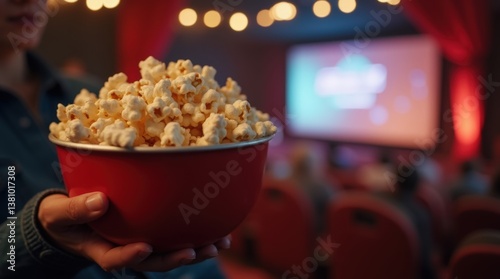 A visually striking scene featuring a person holding a red bowl brimming with popcorn