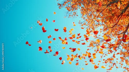 A vivid capture of colorful autumn leaves blowing in the wind against a clear blue sky, showcasing the dynamic movement and beauty of the season, symbolizing change and freedom.