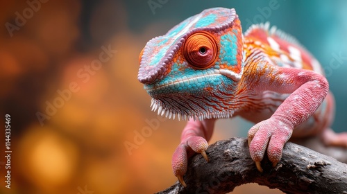 A vivid chameleon with colors beautifully highlighted against a plain backdrop, focusing on the intricate skin textures and unique visual appeal of the reptile.
