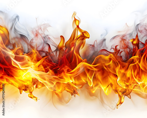 A vivid depiction of fiery flames with wisps of smoke against a white background art