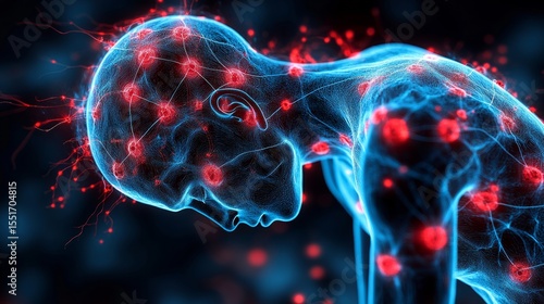 A vivid human head shows neural connections in blue and red, symbolizing thought and emotion