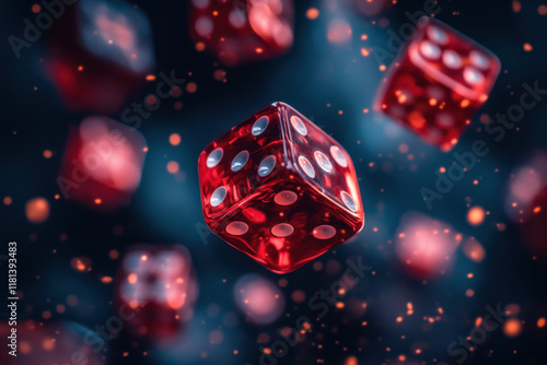 A vivid image of floating red dice with sparkling effects, creating a dynamic and playful atmosphere.