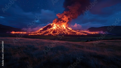 A volcano erupting at night, with lava flowing and ash in the sky