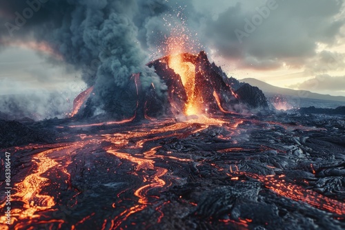 A volcano erupts, spewing out hot lava into the air