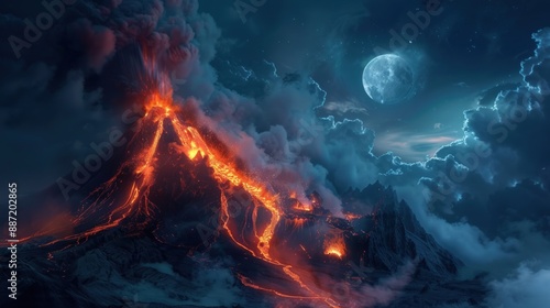 A volcano with a large crater and a bright moon in the sky. Generate AI image