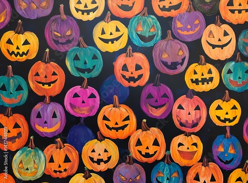 A wall full of smiling pumpkins, painted in vibrant colors and intricate designs.
