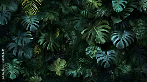A wall of lush, verdant plants, including ferns and Monstera leaves, captured from above in high resolution