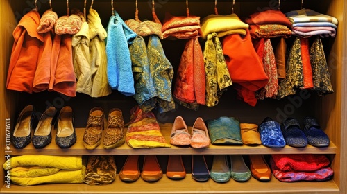 A wardrobe with stylish shoe racks, neatly folded clothes, and subtle lighting.