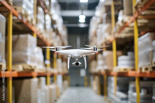 A Warehouse Using Drones To Monitor Inventory Levels. The Environment Is Busy With Automated Systems And High-Tech Equipment