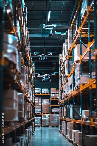 A Warehouse Using Drones To Monitor Inventory Levels. The Environment Is Busy With Automated Systems And High-Tech Equipment