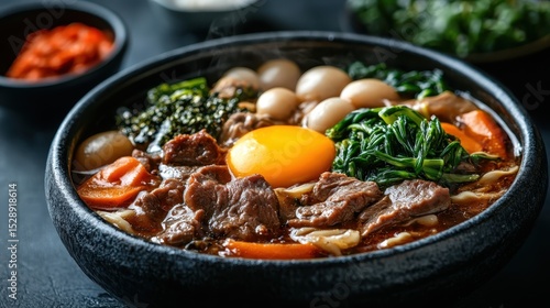 A warm and hearty Korean soup featuring tender beef, vibrant vegetables, a rich broth, and a perfectly cooked egg, served in a traditional stone bowl for maximum flavor.