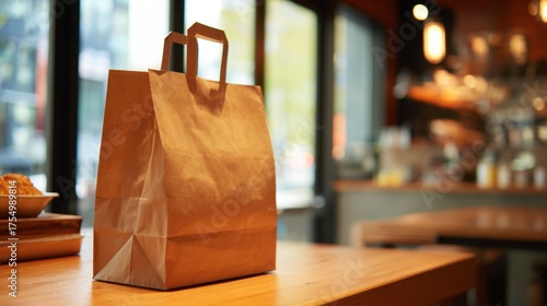 A warm and inviting cafe features a brown paper bag placed on a wooden table capturing the essence of comfort.