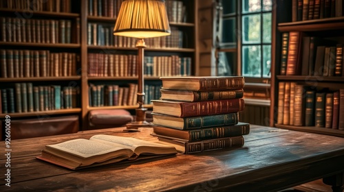 A warm and inviting reading nook with a stack of classic books, a vintage lamp, and a window overlooking a lush green garden. The image evokes a sense of peace, tranquility, and intellectual pursuit.