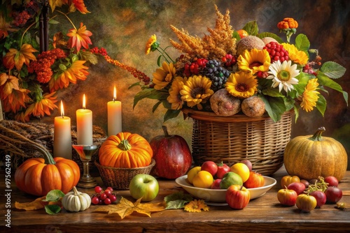 A warm and inviting still life featuring a nostalgic oil painting of a bountiful harvest table setup, surrounded by autumnal fruits, flowers, and vintage decor.