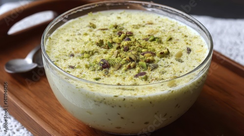 A warm, aromatic bowl of kheer, studded with pistachios - overhead porcelain bowl cooking