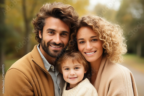 A warm family portrait featuring a smiling couple with their young child, exuding happiness