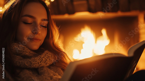 A warm fireplace casting golden light, with a close-up of a beautiful girl reading in the background.