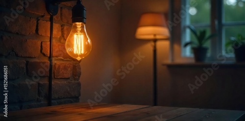 A warm, glowing light bulb illuminates a dark room, casting soft shadows on the wall Perfect for concepts of ideas, inspiration, energy, and home d?cor , innovation, creative, modern
