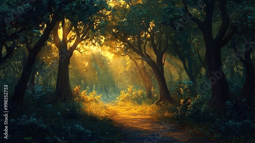 A warm golden light illuminates a path through a dense forest with tall trees casting long shadows.