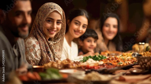 A warm, inviting scene unfolded as a Muslim family gathered around a richly adorned table, savoring the aroma of traditional dishes prepared for the joyous Iftar meal during Ramadan.