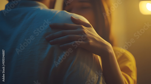A warm, supportive moment between two people, one placing a reassuring hand on the other shoulder in soft lighting.