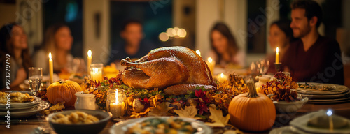 A warm Thanksgiving scene with a family around a festive table, featuring a golden turkey, vibrant sides, and autumn decor. The atmosphere is filled with joy, gratitude, and shared warmth.