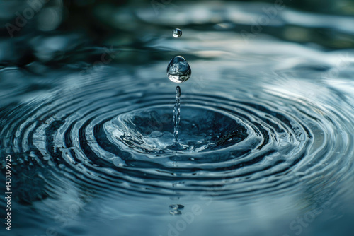 A water droplet falling, creating concentric ripples on a calm water surface.