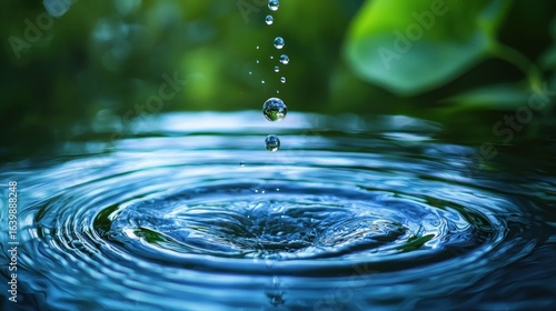 A water droplet falling into a calm body of water, creating a ripple effect.