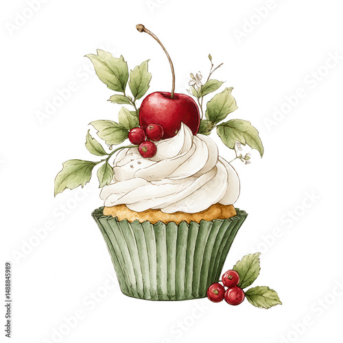A watercolor cupcake topped with frosting and cherries looks simply delicious.