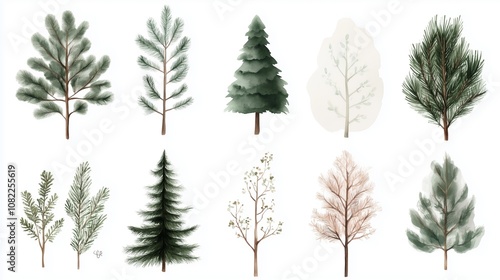 A watercolor illustration of ten different trees, including pine, fir, and deciduous trees, on a white background