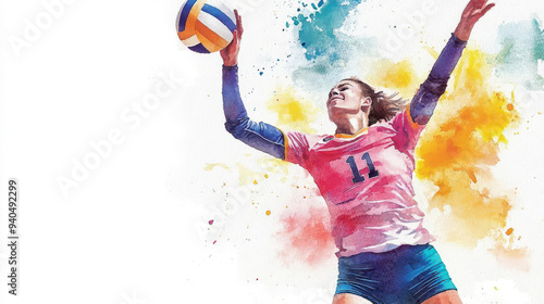 A watercolor of a volleyball player jumping for a spike, with splashes of color indicating movement, watercolor, volleyball, sports