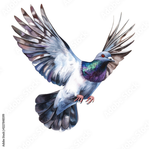 A watercolor painting depicts a vividly colored pigeon in mid-flight with its wings fully extended.