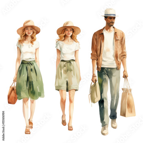 A watercolor painting depicts two women and a man in summer attire carrying shopping bags, showcasing fashionable summer styles.