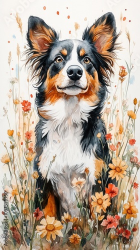 A Watercolor Painting Of A Dog Among Flowers