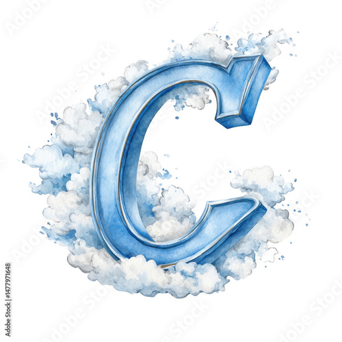 A watercolor painting shows a three dimensional blue letter C with clouds.