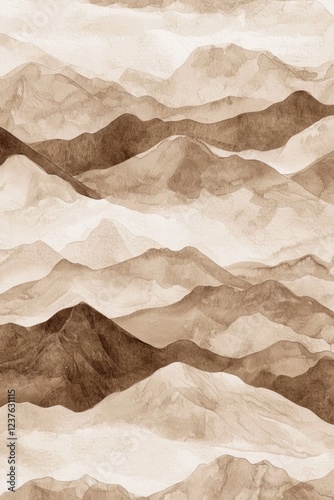 A watercolor seamless pattern depicting mountainous terrain in shades of brown and beige, with soft gradients and fine lines for an elegant touch