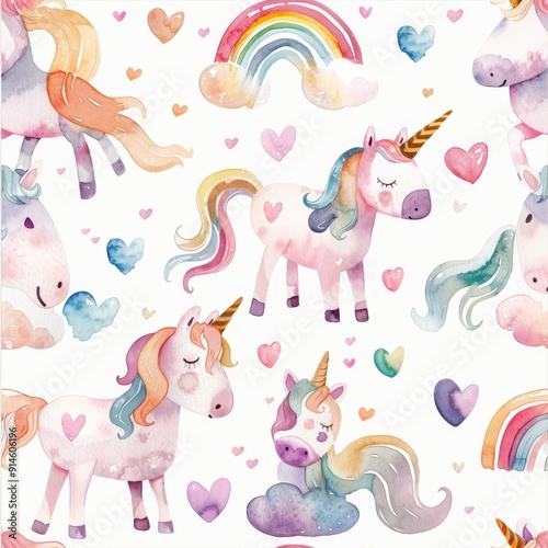 A watercolor unicorn seamless pattern with a cute cartoon pony.