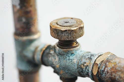A weathered and corroded pipe valve with a distinctive cap, showcasing signs of age and wear in a close-up shot.