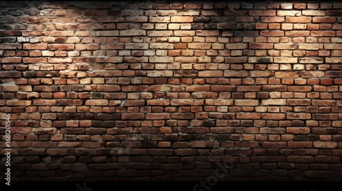 A weathered brick wall with warm spotlights casting shadows, creating a textured background
