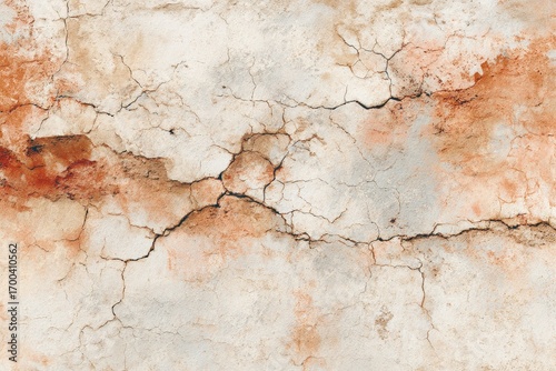 A weathered, cracked surface displays a range of muted earth tones, showcasing the textured variations of aging plaster.