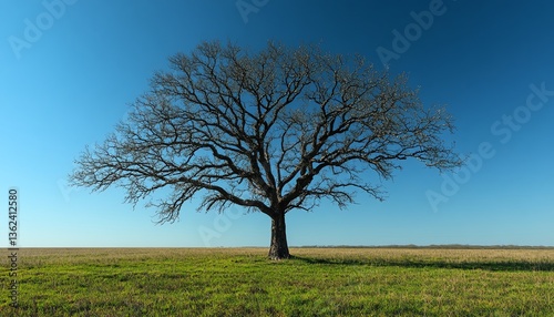 A weathered leafless tree standing proudly in a green pasture, its silhouette bold against a deep blue sky, crisp natural light, hyperrealistic, 8K wallpaper