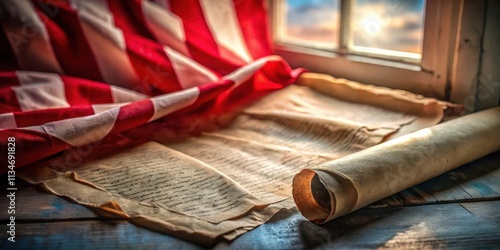 A weathered parchment scroll rests on a wooden table beneath a draped red and white striped cloth, illuminated by the warm glow of a window with sunbeams shining through the glass.