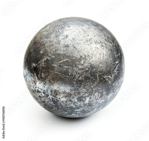A weathered, round metal sphere, isolated on white. Its surface shows signs of age and wear