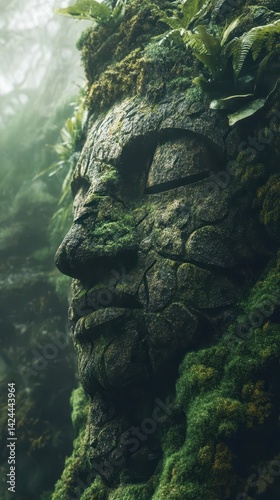 A weathered stone face, overgrown with moss and plants, in a misty forest.